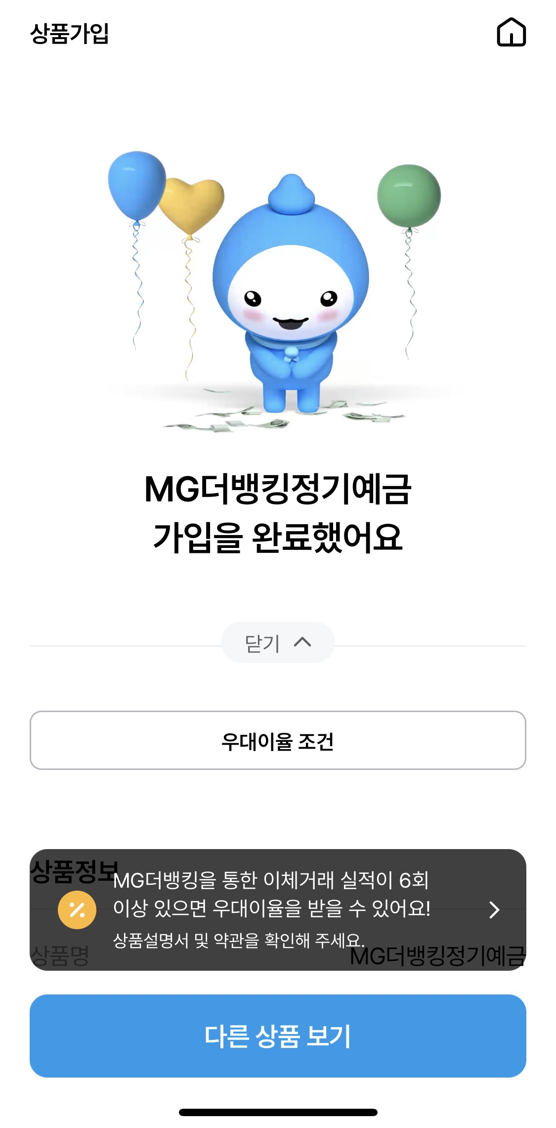 • 스마트폰 앱 MG더뱅킹에서 간편하게 가입할 수 있는 상품으로, 온라인 전용이라 금리가 상대적으로 유리합니다.