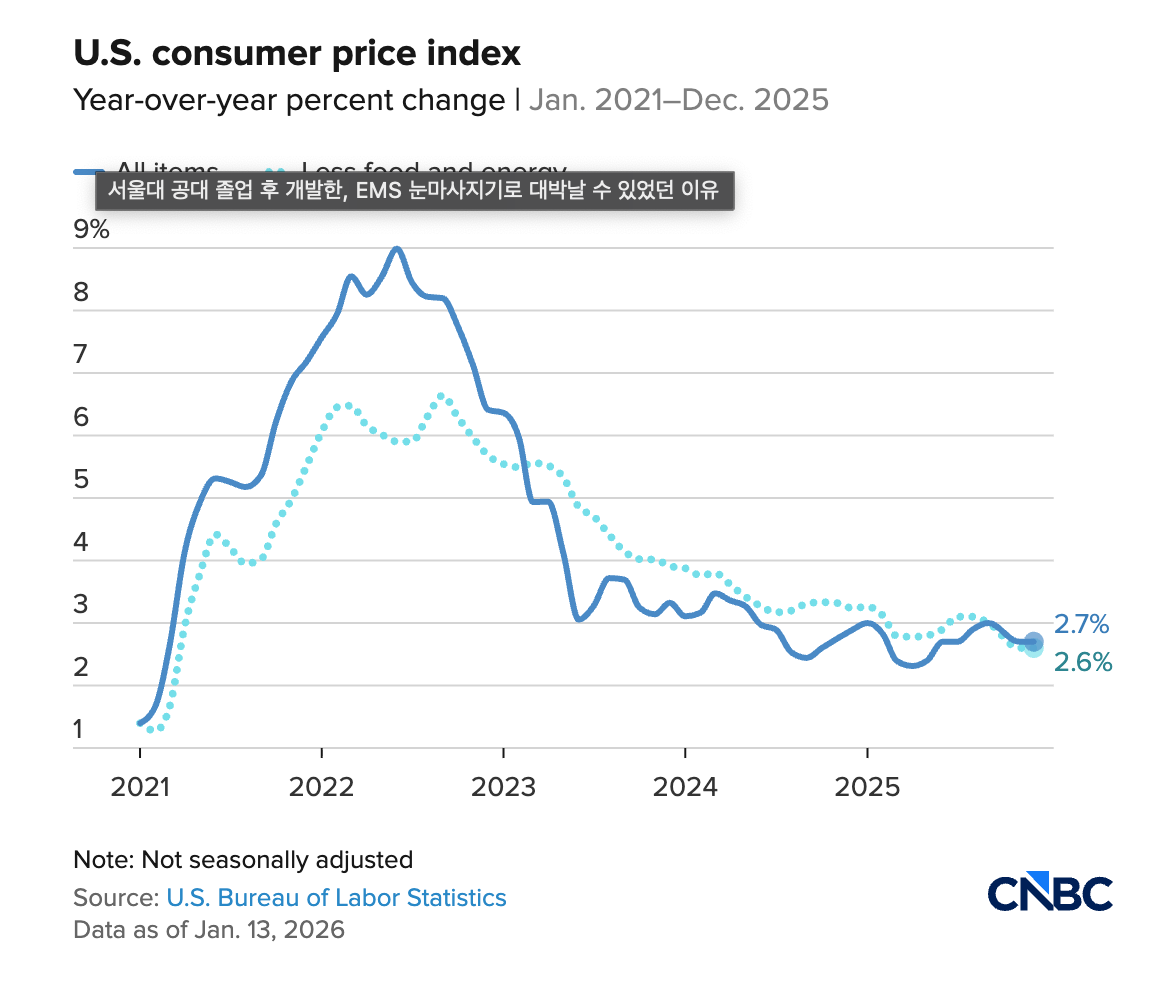 미국 노동통계국(BLS)은 2025년 12월 소비자물가지수(CPI)를 2026년 1월 13일 발표했습니다.