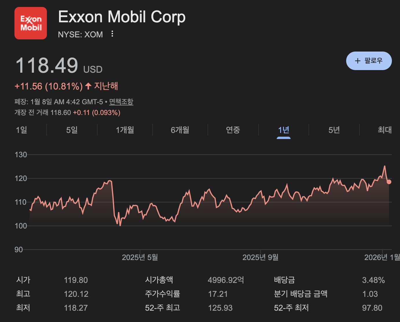 최근 엑손모빌 주가는 국제유가 움직임과 글로벌 지정학적 이슈에 따라 상대적으로 안정적인 상승 흐름을 보이고 있습니다.